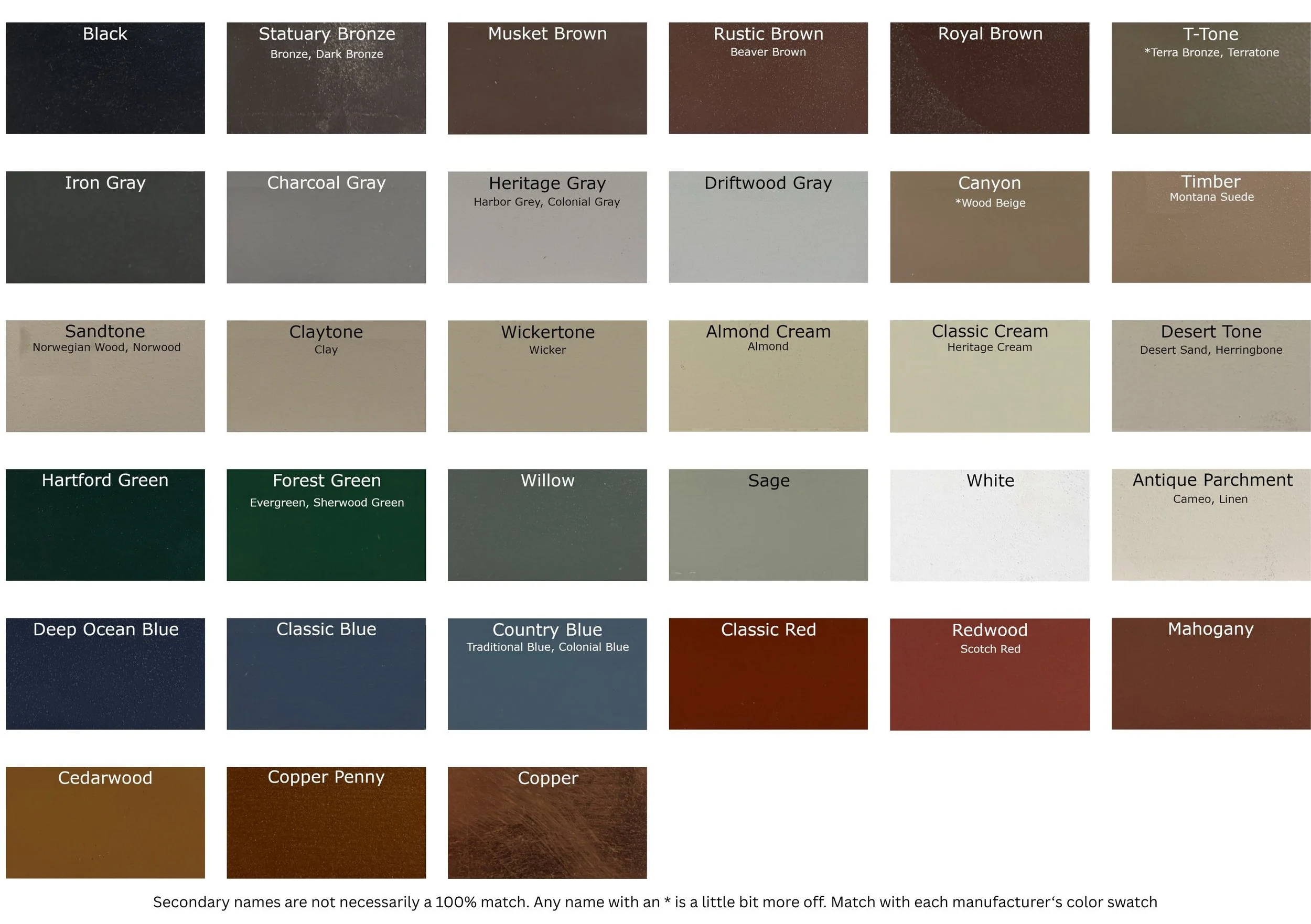 Slides are available in a variety of colors, but primarily offered in EDCO enamel colors. For reference, we've included close visual matches to Senox, Norandex, Spectra, and Lakeside Gutter brands in smaller text below the primary color names. These are not guaranteed perfect matches—always cross-check with the manufacturer's color swatch. An asterisk (*) denotes a match that is somewhat off.